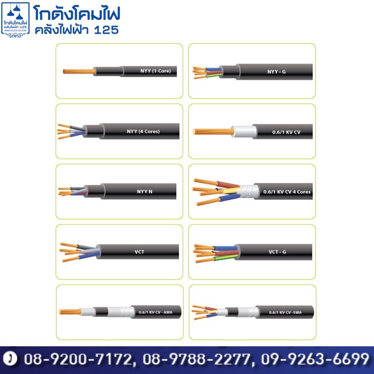 จำหน่ายสายไฟตัวนำทองแดง ขนาด 0.6/1KV-CV หุ้มด้วยฉนวนเปลือกพีวีซีแข็งโค้งงอได้ยาก ได้แก่ สายไฟ THW, VAF, VAF-GRD, NYY หลายแกนสายฉนวน 3 ชั้น, NYY 1 แกน, NYY-GRD